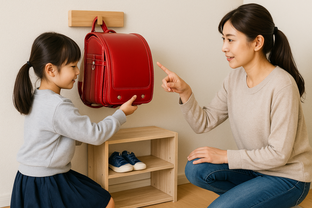 最初のうちは親が「ランドセルを置こうね」と声をかけながら促し、徐々に声かけを減らしていくのがおすすめです。毎日の繰り返しが自然な習慣をつくり、気づけば「帰ってきたらランドセルを置く」が当たり前の行動として定着していきます。